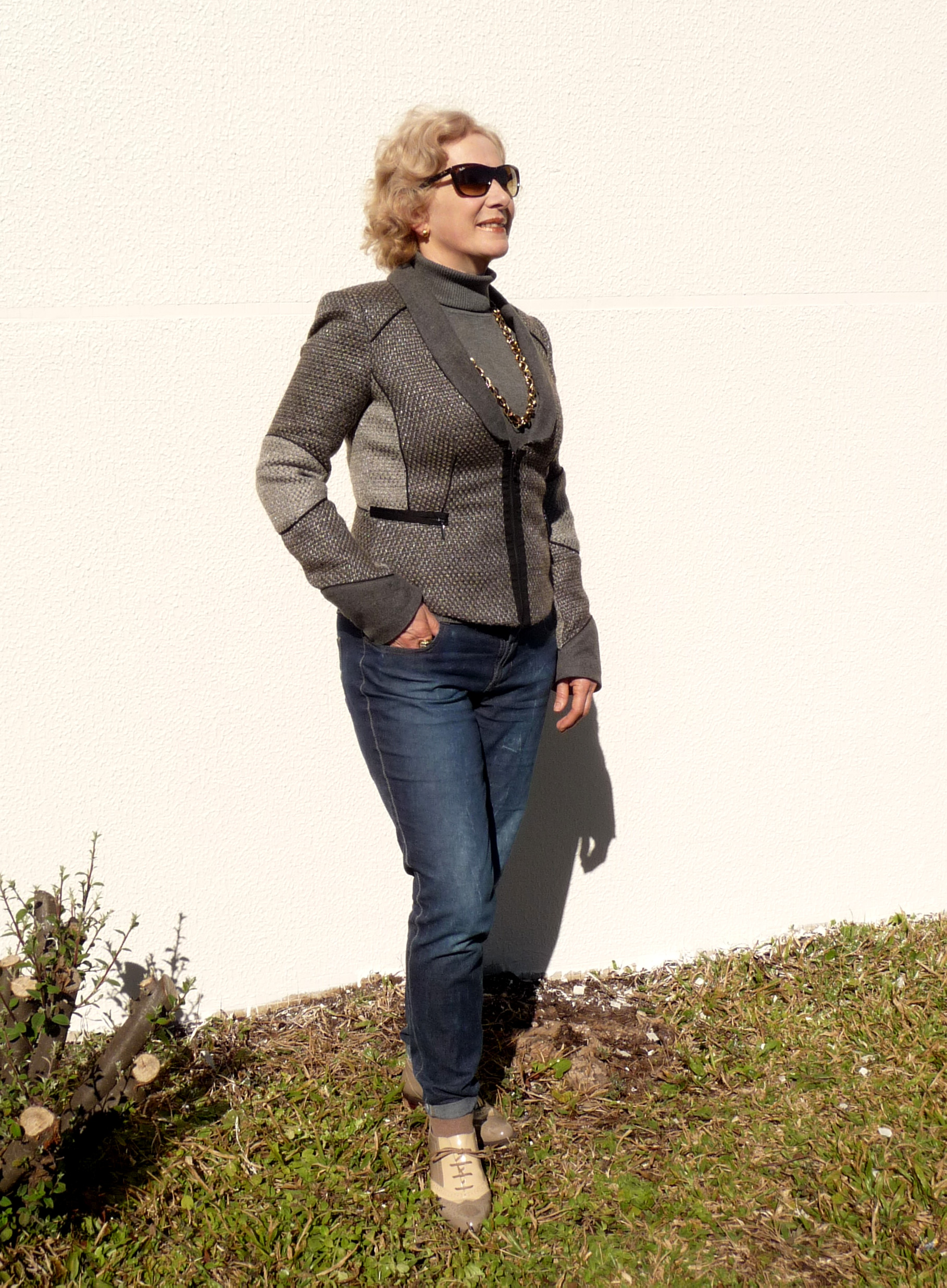 casaqueto de tweed + malha modal gola alta + jeans com lavagem simples + cinto metalizado com efeito craquelado + sapato brogue bicolor + colar de correntes + óculos wayfarer
